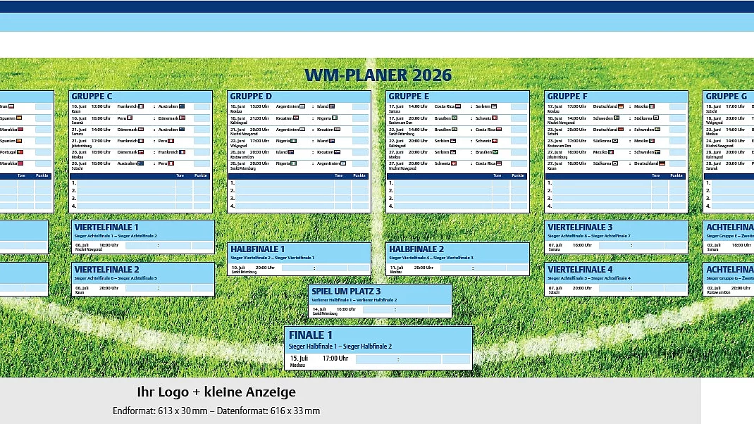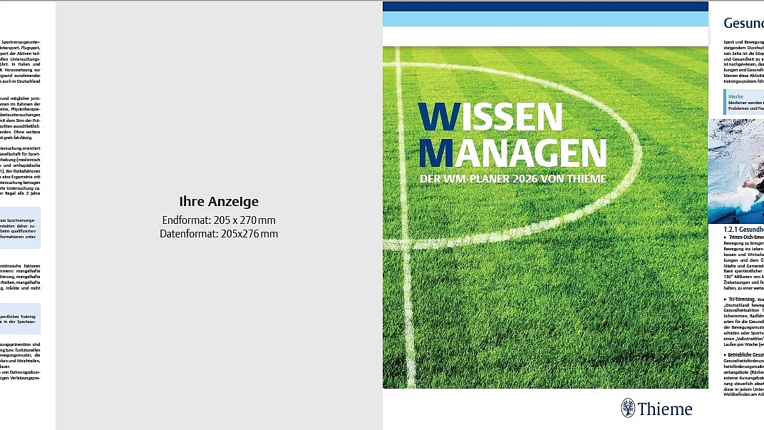 Ihre exklusive Anzeige im Thieme WM-Planer 2026. Nutzen Sie diesen Anlass zur dauerhaften Ansprache Ihrer Zielgruppe. Der Planer kann – je nach Verfügbarkeit – unterschiedlichen Thieme Fachzeitschriften beigelegt werden und begleitet die Leser über die gesamte Turnierdauer hinweg.