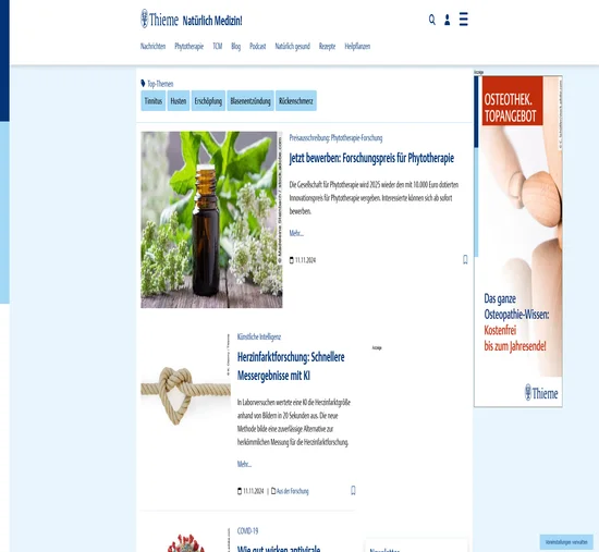 Seit Ende 2021 informiert Natürlich Medizin mit tagesaktuellen Nachrichten, Forschungsergebnissen, Interviews und Fachartikel aus dem gesamten Spektrum der Heilpraxis und Komplementärmedizin. Die rasant wachsenden Nutzerzahlen bestätigen das hohe Interesse an seriösen Informationen in gewohnter Qualität.