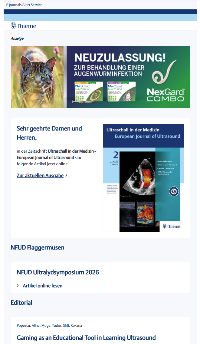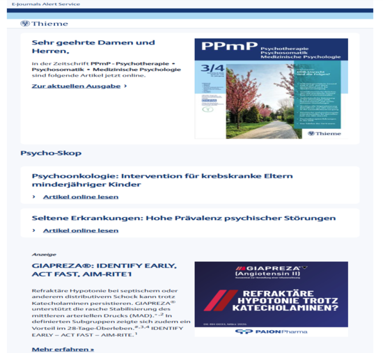 Werbewirkung im Doppelformat: Thieme Journal Alert – Ihre digitale Werbung in der Newsletter- Themenvorschau unserer Abonnenten.
